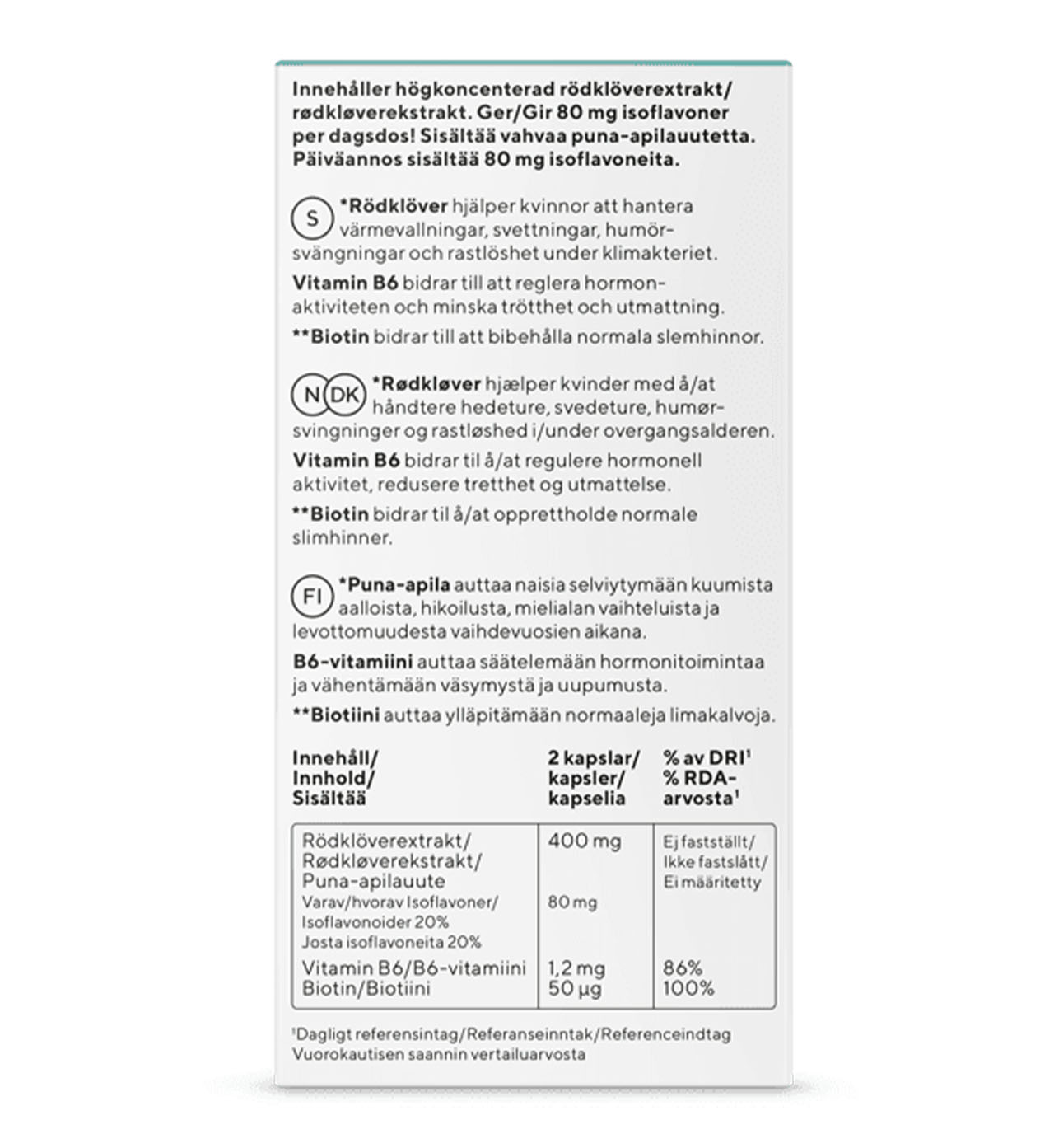 Innehåll Mängd (2 kapslar) % av DRI1 Rödklöverextrakt 400 mg ** – varav Isoflavoner (20%) 80 mg ** Vitamin B6 1,2 mg 86% Biotin 50 µg 100% ** Ej fastställt